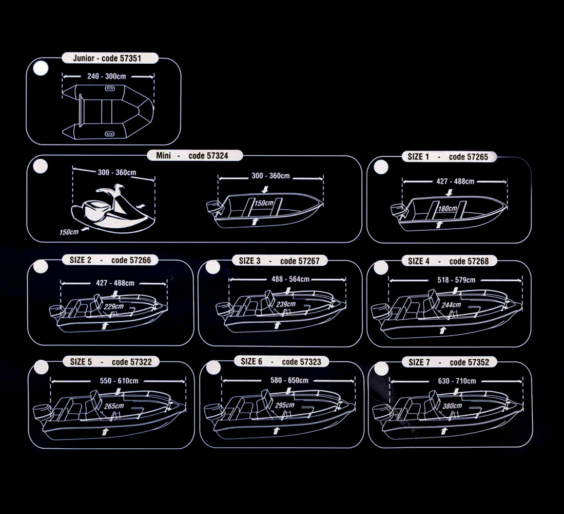 Available in silver, the cover is designed to cover the entire hull (excluding the engine), with a passage under the edge of the boat.
